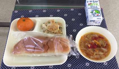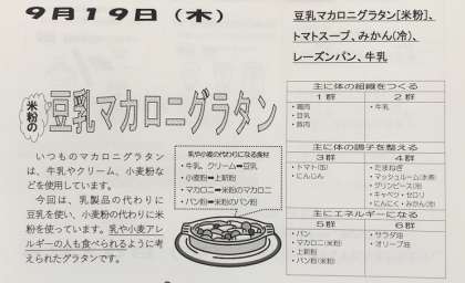 9月19日(木)、今日の給食の献立は『豆乳マカロニグラタン(米粉)・トマトソープ・みかん(冷)・レーゾンパン・牛乳』でした。