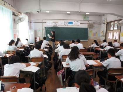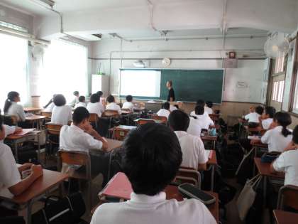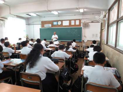 1年生の授業の様子です。上段の写真は数学。中間テストの答案が返却され間違いの多かった問題を復習しています。中段の写真は美術。来週から仮面づくりに取り組みにあたり、電子黒板に映し出されて写真や絵図をもとに仮面の歴史や文化について学んでいます。下段の写真は社会(地理)の授業の様子です。