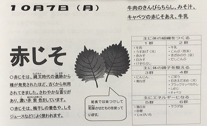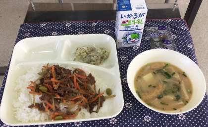10月7日(月)、今日の給食の献立は『牛肉のきんぴらちらし・みそ汁・キャベツの赤じそあえ・牛乳』でした。