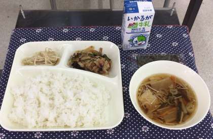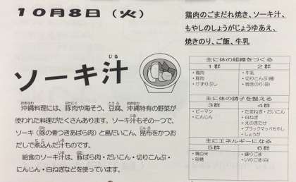 10月8日(火)、今日の給食の献立は『鶏肉のごまだれ焼き・ソーキ汁・もやしのしょうがじょうゆあえ・焼きのり・ご飯・牛乳』でした。