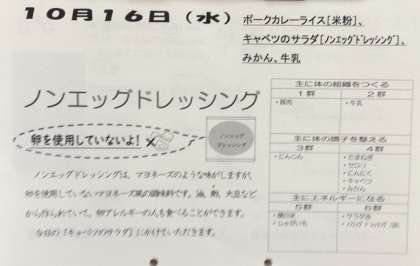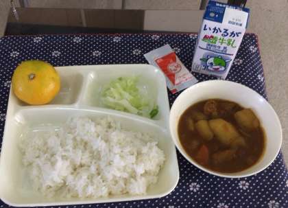 10月16日(水)、今日の給食の献立は『ポークカレーライス(米粉)・キャベツのサラダ(ノンエッグドレッシング)・みかん・牛乳』でした。みんなでおかわりをして、完食しました。