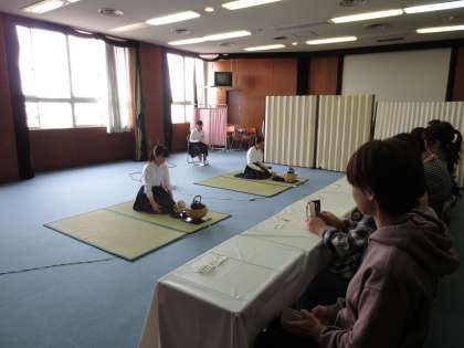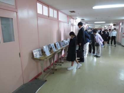 保護者の皆さまにも数多くご来校いただき、感謝申しあげます。上段の写真は茶道部のお点前、下段の写真は美術科の作品を鑑賞していただいている様子です。