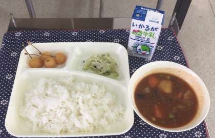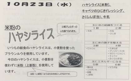 10月23日(水)、今日の給食の献立は『ハヤシライス(米粉)・キャベツのひじきドレッシング・さくらんぼ(缶)・ご飯・牛乳』でした。各学級でおかわりをして完食となりました。