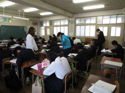 本校の各教室には電子黒板が設置されており、授業用パソコンと連動させることで、電子教科書やインターネットで集めた画像などを、スクリーンに投影することができます。写真は数学の授業の様子です。(上段は3年生、中段は2年生)図形(辺)上の点が移動するときや垂直二等分線の作図などのプロセスが画面上に写し出されるので、生徒にとって非常に分かりやすいです。なお2年生の授業は、学力向上推進モデル校事業の一環として、教育センターから指導教諭を迎えて、授業後に振り返りを行いました。