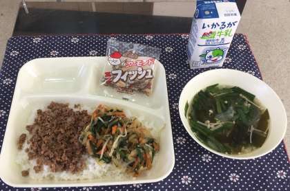 11月7日(木)、今日の給食の献立は『ビビンバ(ご飯)・わかめスープ・アーモンドフィッシュ・牛乳』です。