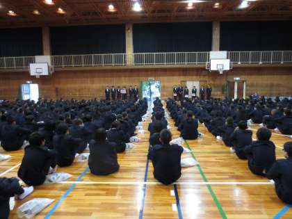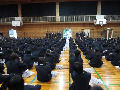 全校集会が行われました。まず初めに部活動の表彰。野球部が4ブロック(淀川区・西淀川区・東淀川区)で優勝。卓球部が、同じく4ブロックで準優勝の成績を収めました。おめでとうございます。校長講話のあと、各委員会で話し合ったことがらについて、代表生徒より報告がありました。最後に、昨日地域の防災訓練に参加した防災リーダーから、活動の様子について報告がありました。