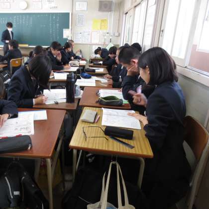 2年生国語の授業の様子です。今日は文法の学習です。前半は「ない」の班別について学習しました。「ない」には、形容詞の「ない」、形容詞の一部の「ない(例)きたない」、補助形容詞の「ない(例)甘くない」、助動詞の「ない(例)飲まない」の4タイプがあります。日常何気なく使っている「ことば」ですが、きちんと区別できるようにしたいですね。後半は副詞について学んだ後、ワークブックで演習しました。分からないところは班のメンバーで教え合います。