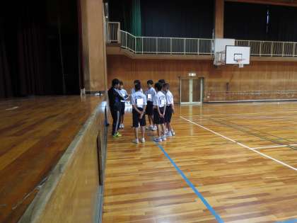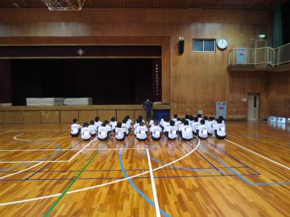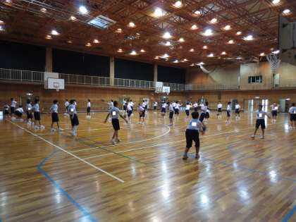 1年生保健体育の授業の様子です。今日の単元は球技(バスケットボール)。諸注意を聞いた後、チェストパスの復習から始めました。次にサイドハンドパスを新たに学んでから、H班編成を組みました。各班のリーダーはバスケットボール部員、もしくはバスケットボール経験者です。ドリブル練習は、リーダーのアドバイスを受けながら、班別に取り組みました。授業終了後、リーダーに次時に向けて教科担当が助言を送りました。
