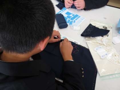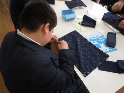 1年生家庭科の授業(刺し子)の様子です。模様にそって、丁寧に縫っていきます。写真には写っていませんが、元気アップのご協力のもと、ボランティアの皆さまが家庭科教諭とともに、生徒の指導にあたってくださっています。ボランティアの皆さまありがとうございます。