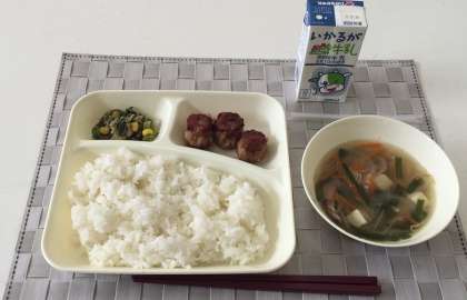 明日の献立は、地場産物活用の取り組みとして『田辺だいこん』を給食に使用するため、『鶏肉の甘辛焼き・田辺だいこん葉のみそ汁・田辺だいこんの煮もの・ご飯・牛乳』の予定です。