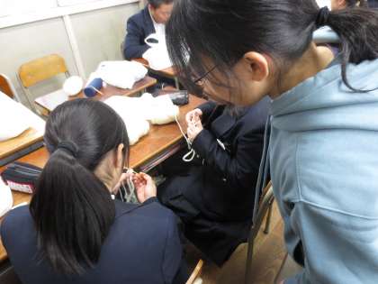 元気アップのボランティアの皆さまの協力のもと、毛糸を使い手編みで修学旅行(スキー)用の帽子づくりに取り組みました。
