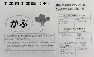 12月12日(木)、今日の給食の献立は『鶏肉と野菜の煮もの・じゃこ豆・かぶのゆず風味・ご飯・牛乳』です。
