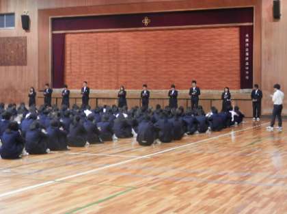 生徒会の役員・学級委員の後期認証式を来週の火曜日に行います。それに向けて、3年生では朝の学年集会において、前期学級代表より、それぞれの学級の反省も含めて学級代表より話がありました。後期の取り組みに向けての思いを引き継ぎました。