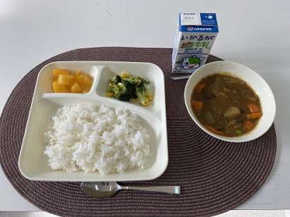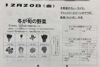 12月20日(金)、今日の給食の献立は『冬野菜のカレーライス(ごはん)・ブロッコリーとコーンのサラダ・黄桃(カット缶)』でした。各クラス、おかわりをして完食でした。