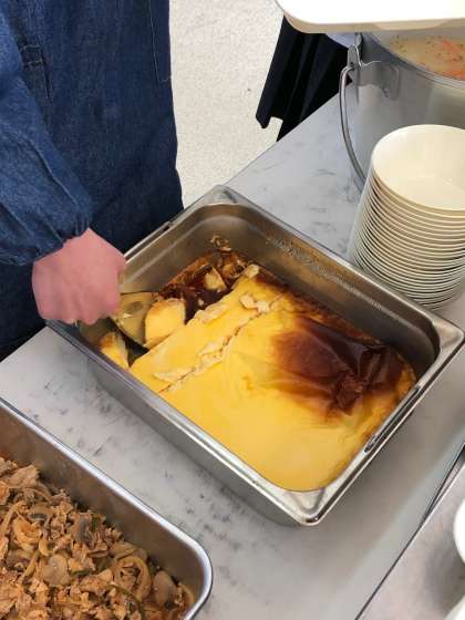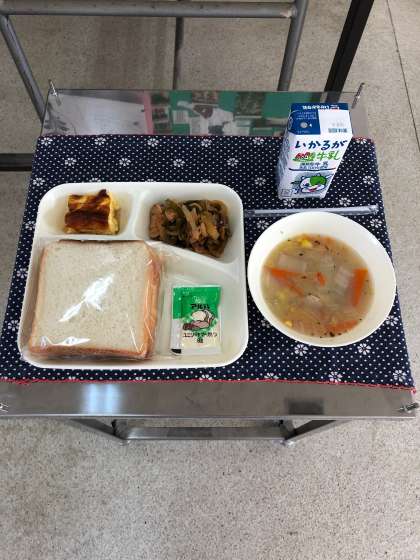 今日の給食の献立は、『パン、牛乳、豚肉のケチャップソテー、コーンスープ、焼きプリン、ソフトマーガリン』です。焼きプリンは、給食調理員さん渾身のメニューです。おいしくいただきました。明日の献立は、『ごはん、牛乳、いわしのしょうが煮、うすくず汁』です。明日の給食が、年内最終となります。