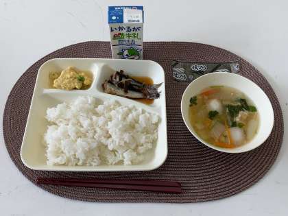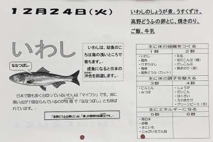 12月24日(火)、今日の給食の献立は『いわしのしょうが煮・うすくず汁・高野豆腐の卵とじ・ご飯・焼きのり・牛乳』でした。