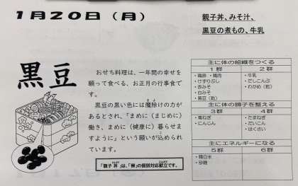 1月20日(月)、今日の給食の献立は『親子丼(ごはん)・みそ汁・黒豆の煮もの・牛乳』でした。
