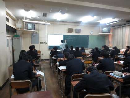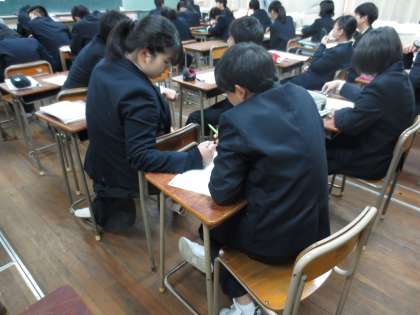 3年生の数学の授業の様子です。単元は三平方の定理。問題演習に臨みました。与えられた図形の中に直角三角形を見出し、三平方の定理を用いて辺の長さを求めます。生徒どうし、解法について相談しあい場面が随所に見られました。