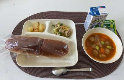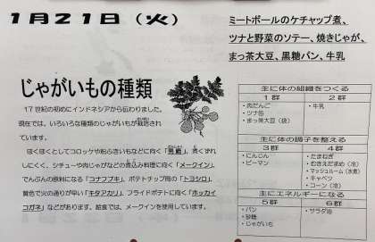 1月21日(火)、1年生は臨時学年休業のため、2・3年生のみ給食実施で、献立は『ミートボールのケチャップ煮・ツナと野菜のソテー・焼きじゃが・まっ茶大豆・パン・牛乳』でした。明日も1年生は臨時学年休業のため、2・3年生のみ給食実施で、献立は『豚肉と金時豆のカレーライス(ごはん)・焼きミニハンバーグ・ごぼうサラダ・プチトマト』の予定です。