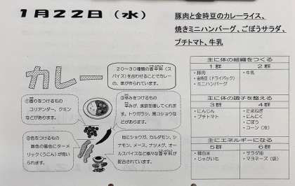 1月22日(水)、今日は、1年生が臨時学年休業のため、2・3年生のみ給食実施で、献立は『豚肉と金時豆のカレーライス(ごはん)・焼きミニハンバーグ・ごぼうサラダ・プチトマト』でした。