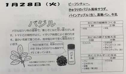 1月28日(火)、今日の給食の献立は『ビーフシチュー・きゅうりのバジル風味サラダ・パイナップル(缶)・パン・牛乳』でした。