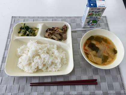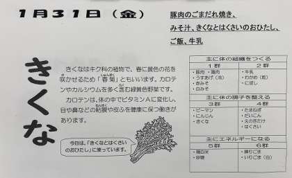 1月31日(金)、給食の献立は『豚肉のごまだれ焼き・みそ汁・きくなとはくさいのおひたし・ごはん・牛乳』でした。