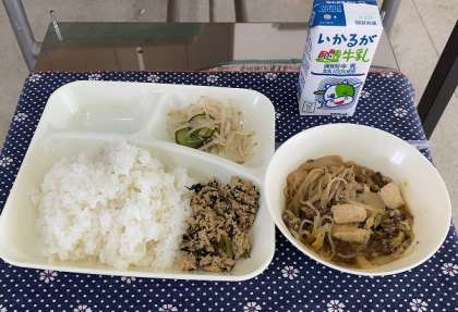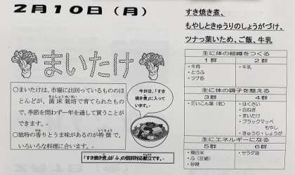 2月10日(月)、今日の給食の献立は『すき焼き煮・もやしときゅうりのしょうがづけ・ツナっ葉いため・ごはん・牛乳』でした。