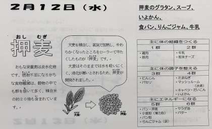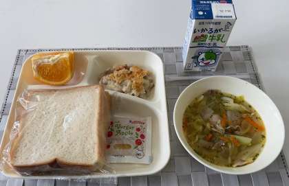 2月12日(水)、今日の給食は、1年生のみ実施で献立は『押麦のグラタン・スープ・いよかん・りんごジャム・パン・牛乳』です。