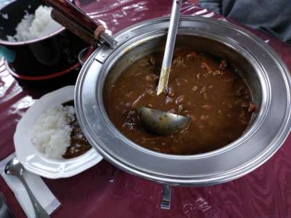 今日の昼食はカレーライスです。食事の前には、全員手をアルコール消毒しています。