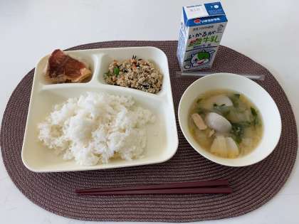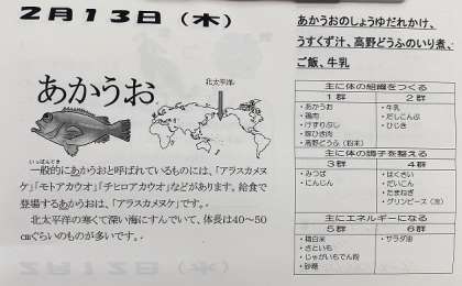2月13日(木)、今日は1年生のみ給食実施で献立は『あかうおのしょうゆだれかけ・うすくず汁・高野どうふのいり煮・ごはん・牛乳』でした。