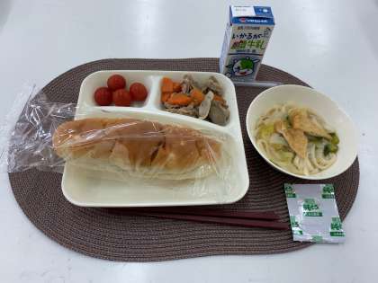 2月14日(金)、今日は1年生のみ給食実施で献立は『豚肉とごぼうの煮もの・なにわうどん・プチトマト・パン・牛乳』です。