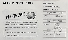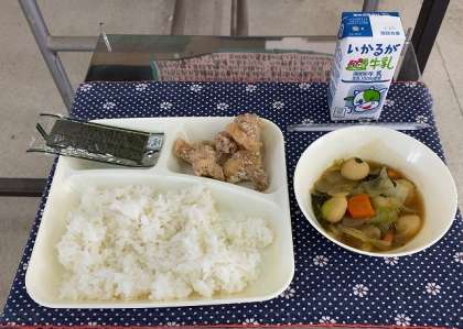2月17日(月)、今日の給食の献立は、『鶏肉のからあげ・まる天と野菜のうま煮・焼きのり・ごはん・牛乳』でした。