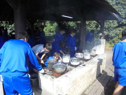 心地よい晴天の下、屋外で仲間と協力し合い、おいしい食事を作って食べました。