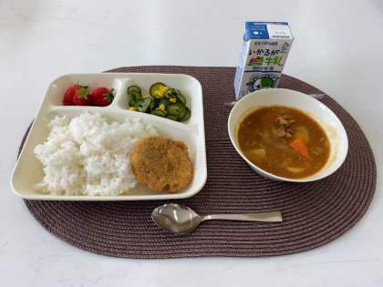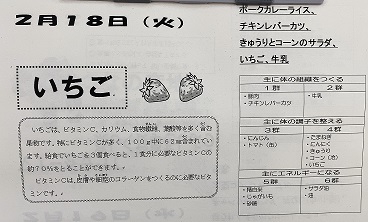 2月18日(火)、今日の給食の献立は『ポークカレーライス(ごはん)・チキンレバーカツ・きゅうりとコーンのサラダ・いちご・牛乳』でした。