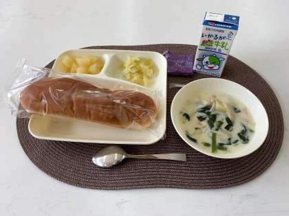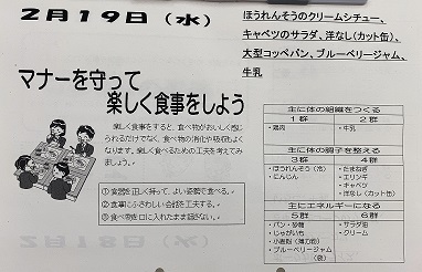 2月19日(水)、今日の給食の献立は『ほうれんそうのクリームシチュー・キャベツのサラダ・洋なし(カット缶)・ブルーベリージャム・パン・牛乳』でした。