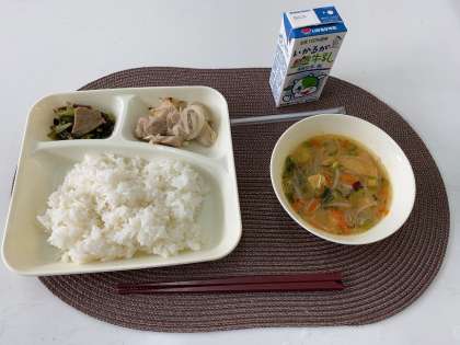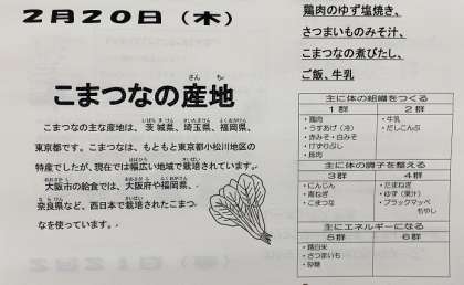 2月20日(木)、今日の給食の献立は『鶏肉のゆず塩焼き・さつまいものみそ汁・こまつなの煮びたし・ごはん・牛乳』です。