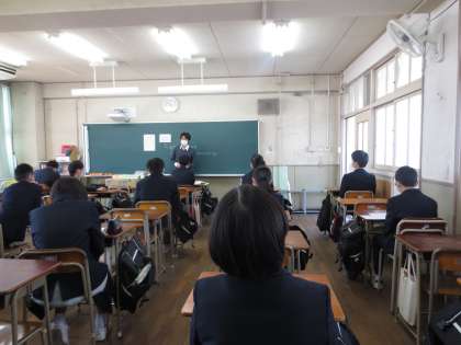 今朝は2年生が登校しています。学年末テストの答案やチャレンジテストの結果を返却するのが主な目的です。各クラスを2つのグループに分け、大勢が一堂に会さないよう工夫しています。半数の生徒は、午後からの登校となります。
