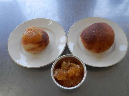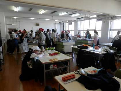 家庭科の先生と、学校元気アップのコーディネータの方が講師となり、生徒といっしょに「ふわふわパンとリンゴジャム」作りに挑戦しました。班によって出来栄えはいろいろでしたが、みんなで、おいしくいただきました。