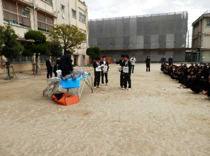 非常ベルと放送の合図で全員が運動場に避難しました。