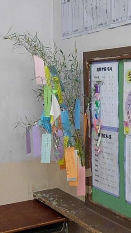 七夕の由来は、皆さんもご存知の織姫・彦星の星物語から始まります。天の川に輝く琴座のベガが織姫(織女星)で、鷲座のアルタイルが彦星(牽牛星)です。新暦の7月7日はまだ梅雨のさなかで星空もよく見えないかもしれませんが、旧暦の七夕は現在の8月なので夜空もきれいで二つの星もはっきりと見ることができたことでしょう。1年生の各教室には、それぞれに願い事を書いた短冊をつけた笹が置かれています。みんなの願い事が叶うといいですね。