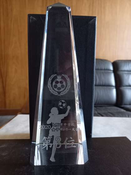 第2学期始業式を放送で行いました。また、始業式に先立って「大阪市中学校女子サッカー大会」で第3位になった女子サッカー部員への表彰が放送で行われました。トロフィーの授与はできませんでしたが、立派なトロフィーをもらっています。
