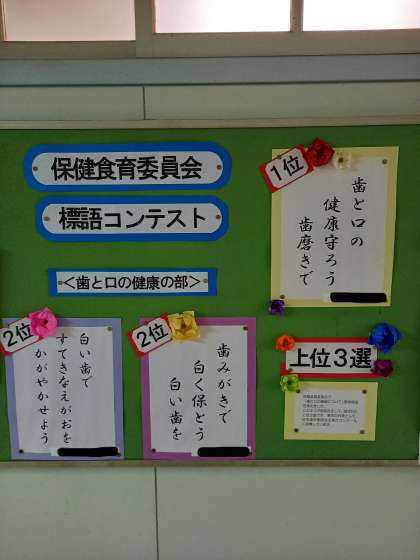 保健食育委員会で「歯と口の健康について」啓発標語を考えました。この3つが投票会をして、選ばれた上位3選です。美中の代表として、日本歯科医師会主催のコンクールに応募します。