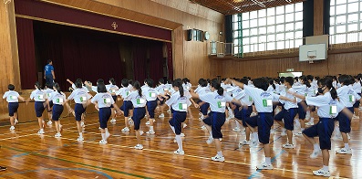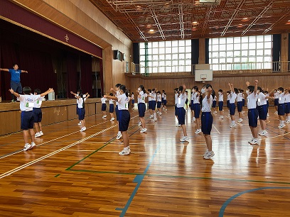 9月9日(水)、9月25日(金)の『体育祭』にむけて、各学年で練習を行いました。写真は、1年生の練習の様子で、雨天のため、体育館で実施しました。