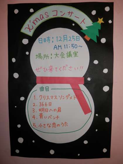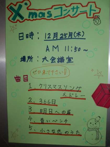 今年も25日(木)の終業式の後、大会議室において午前11時50分から演奏する予定です。生徒のみなさんはもちろんのこと、保護者の方も大歓迎!どうぞお越しください。