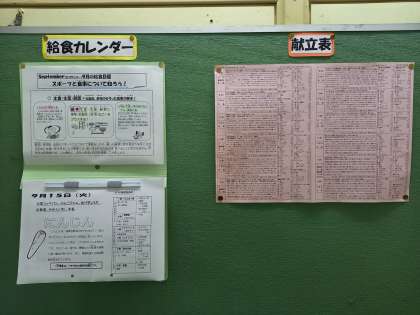 コロナの影響で、食堂での喫食がなくなったので、今まで食堂に掲示していた「給食カレンダー」を職員室前の掲示板に「献立表」と合わせて掲示しています。ぜひ、チェックしてくださいね。