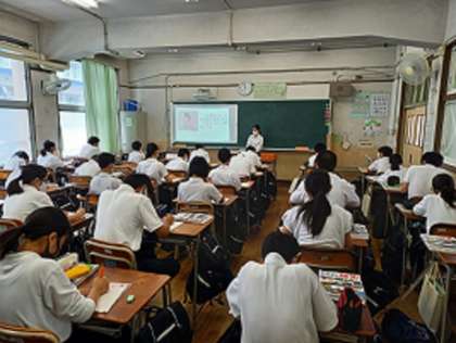 6人の教育実習生の研究授業が、本日から3日間の予定で行われます。今日は、4時間目に1年5組で社会、6時間目に1年4組で英語の研究授業が行われました。