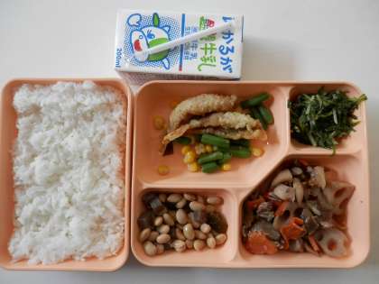 本日のメニューは、・糸よりの磯辺揚げ・三度豆のコーンの炒め物・筑前煮・煮豆・水菜のごまあえ でした。