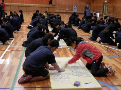体育館に畳1枚を19箇所に分け、学級対抗形式で1グループ10名(各学級男女各1名)で先生方が読み手となり、みんなで札を取りあいました。