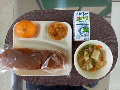 給食の変わりピザは、ギョーザの皮に、ツナ、コーン、ピーマン、ピザソース、チーズを混ぜ合わせた具をのせ、焼き物機で焼いています。