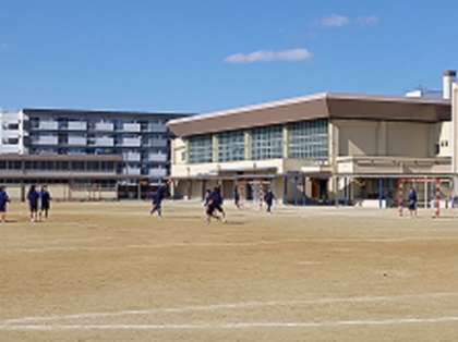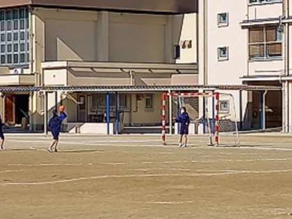 グランドでは、3年生女子が体育科(ハンドボール)の授業に臨んでいます。パスからのシュート練習を行っています。